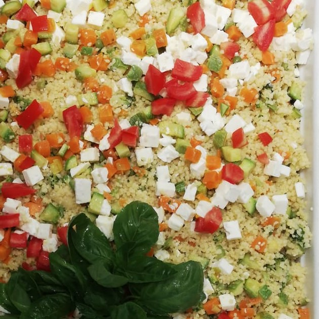 cous cous, carote, cipolle, melanzane, zucchine, fagiolini*, curcuma, feta, basilico, brodo di verdure, salsa di soia, olio evo, sale, pepe