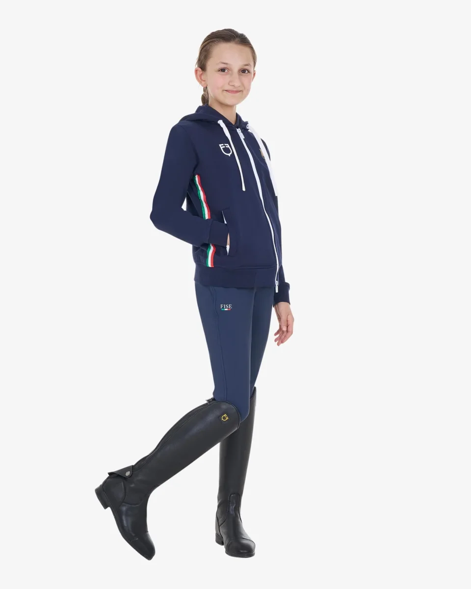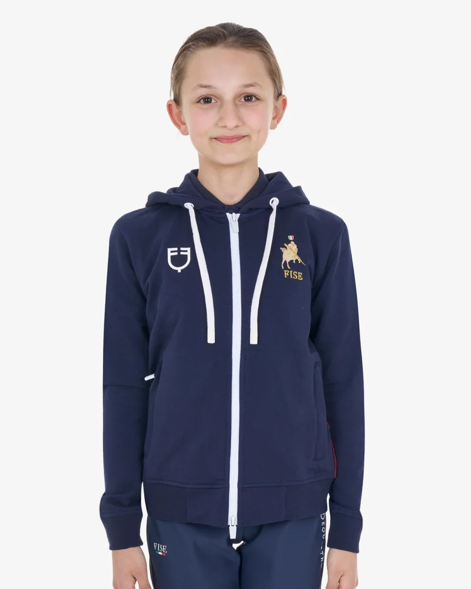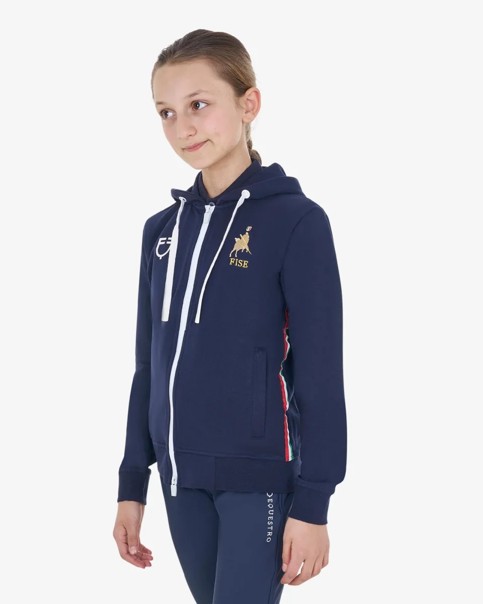 Felpa per bambini Equestro X FISE realizzata in morbido cotone con pratica zip frontale antivento e cappuccio regolabile, per offrire al pilota un comfort senza pari.