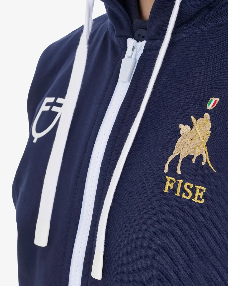 La presenza di decorazioni di piping a contrasto rende il capo elegante, in pieno stile Equestro e il ricamo FISE rende la felpa unica nel suo genere.