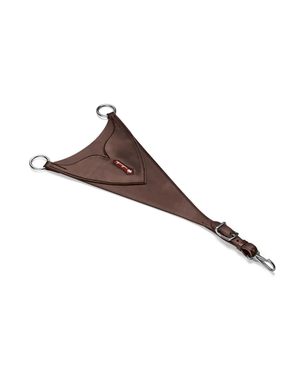 Forchetta per martingala a ventaglio, regolabile, in cuoio naturale, con fibbie/finiture in ottone e acciaio.