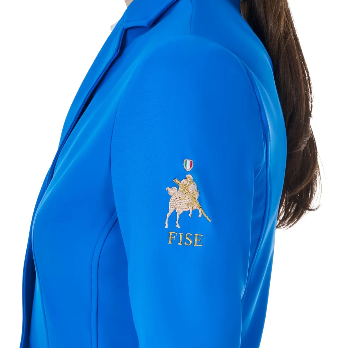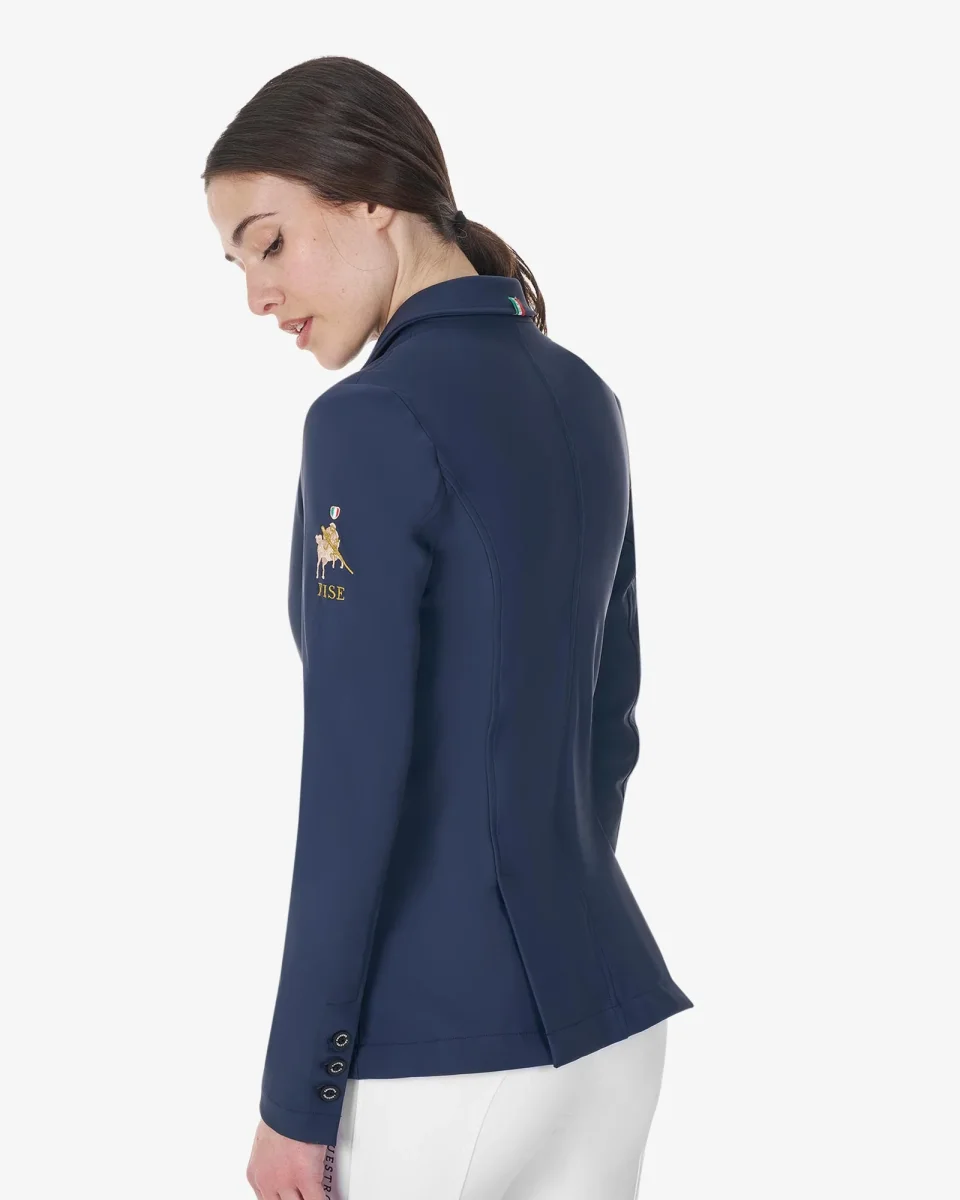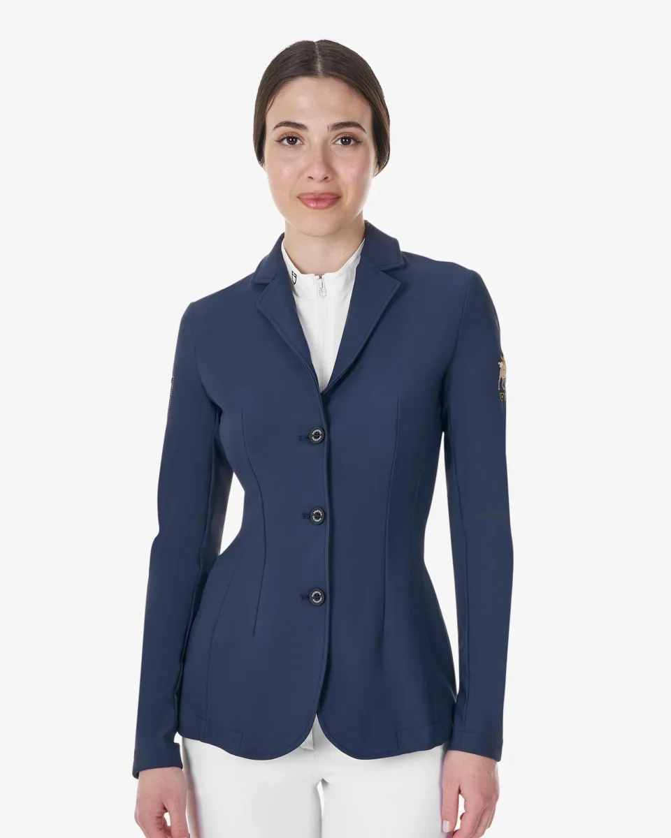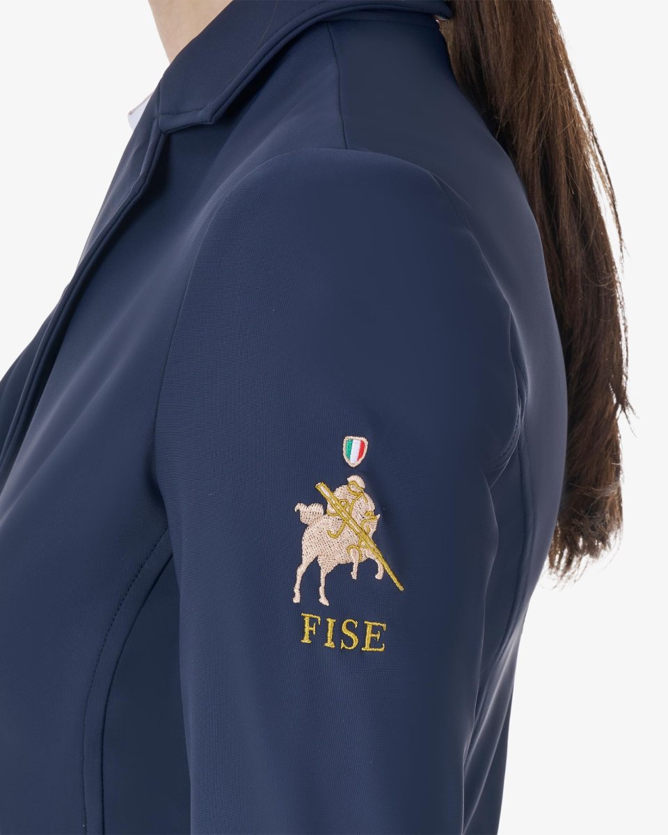 Giacca da concorso donna slim fit Equestro X FISE, realizzata in tessuto tecnico, elastico e performante.