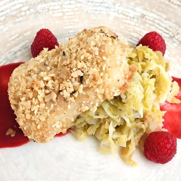 Merluzzo con panatura croccante di Mandorle Verza e Lamponi