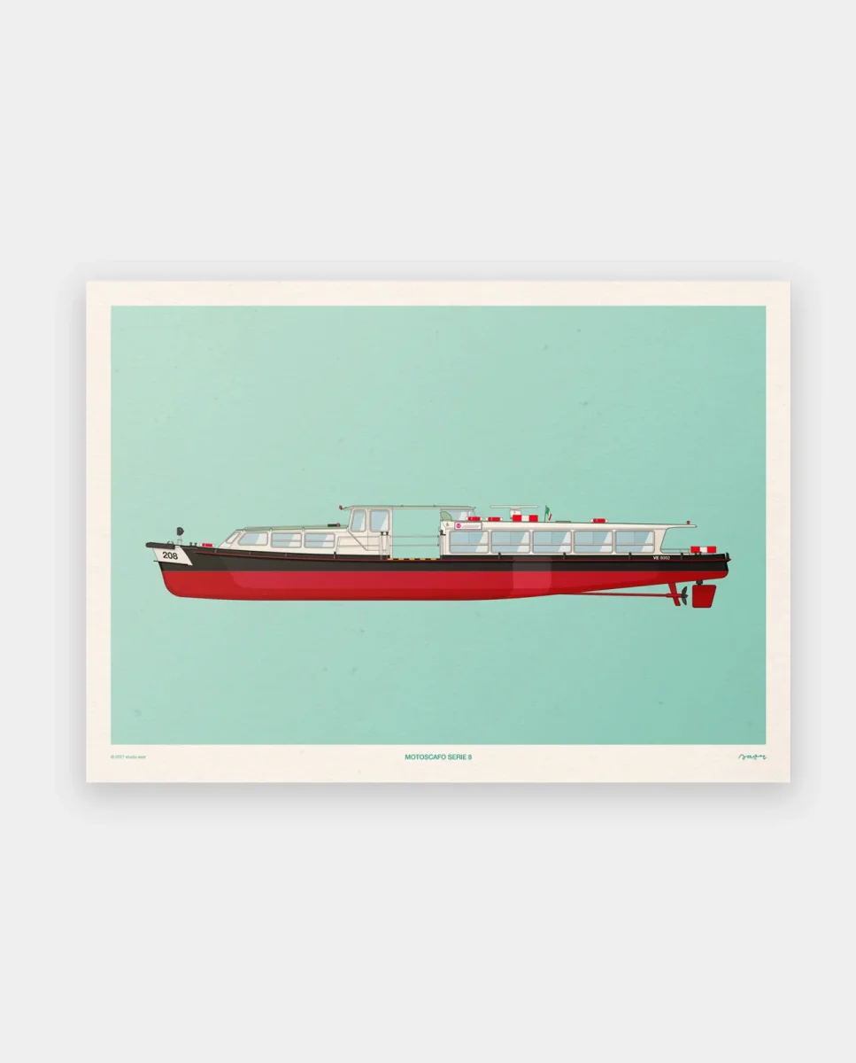 Motoscafo Serie 8 è una piccola e veloce imbarcazione che naviga intorno alla città per collegarne i confini esterni, potresti vederla attraccare all’Isola della Giudecca o addirittura a Murano: questo poster vuole onorarla, illustrandola in tutta la sua longeva bellezza!