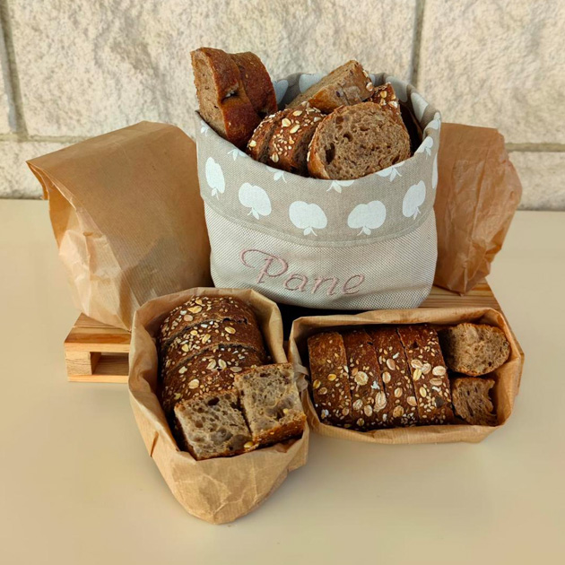 pane integrale con farina di grano tenero integrale, acqua, farina tipo “0”, lievito di birra, sale
