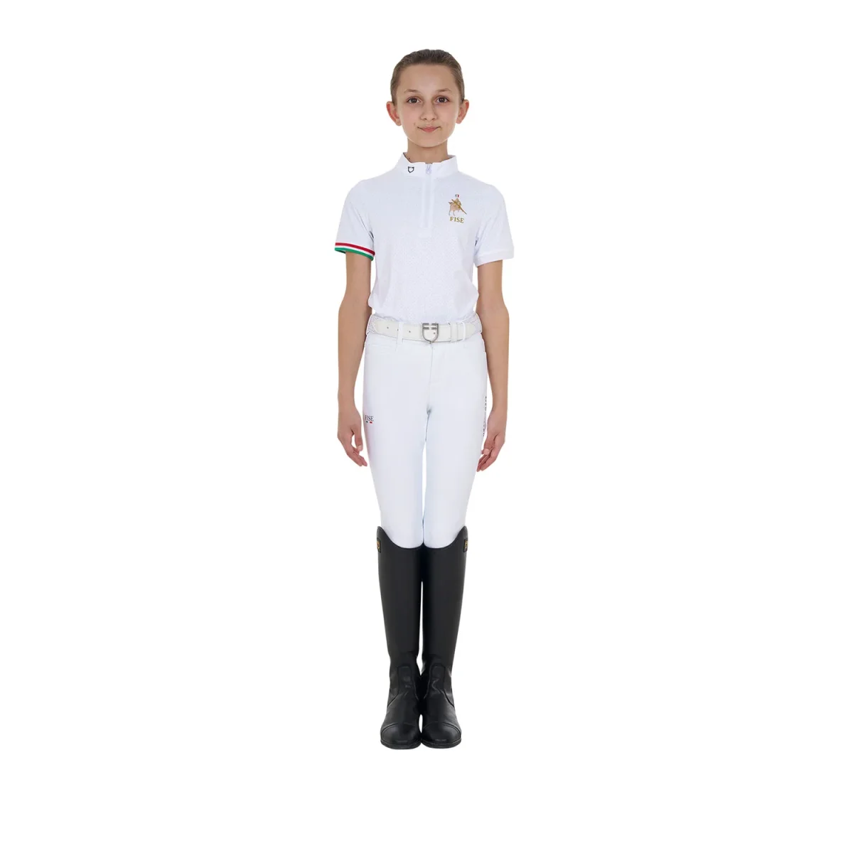 Polo bambina slim fit da concorso Equestro X FISE a manica corta in tessuto tecnico, garanzia di massimo comfort e totale libertà dei movimenti.