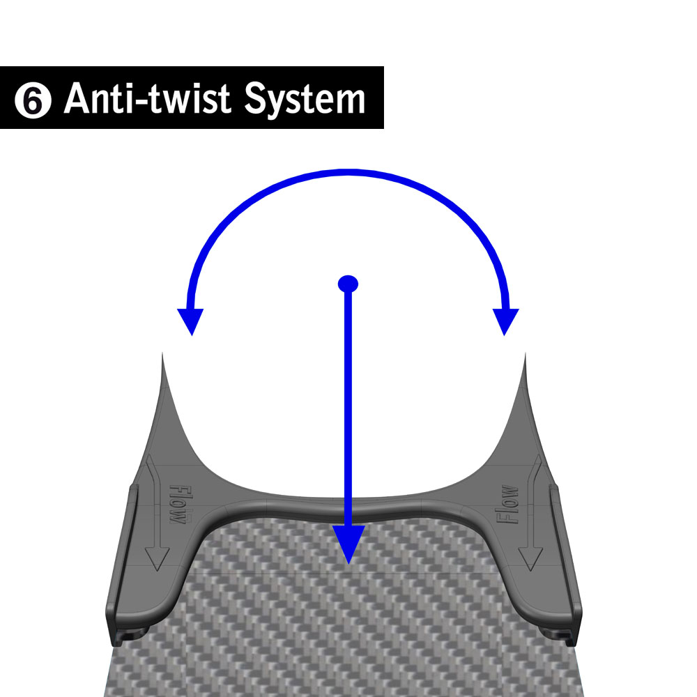 6) Anti-twist System: La struttura frontale della scarpetta s-WiNG è progettata con una struttura rinforzata ad U che stabilizza la pala e ne evita il rollio durante la pinneggiata.