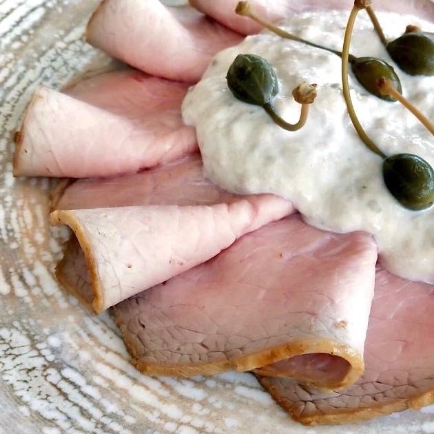 carne di vitello, vino bianco, tonno sott’olio, maionese (olio di semi di girasole, acqua, tuorlo d’uovo pastorizzato, aceto di vino, amido di mais, sale, addensante, succo di limone, aromi), capperi, olio evo, sale, pepe